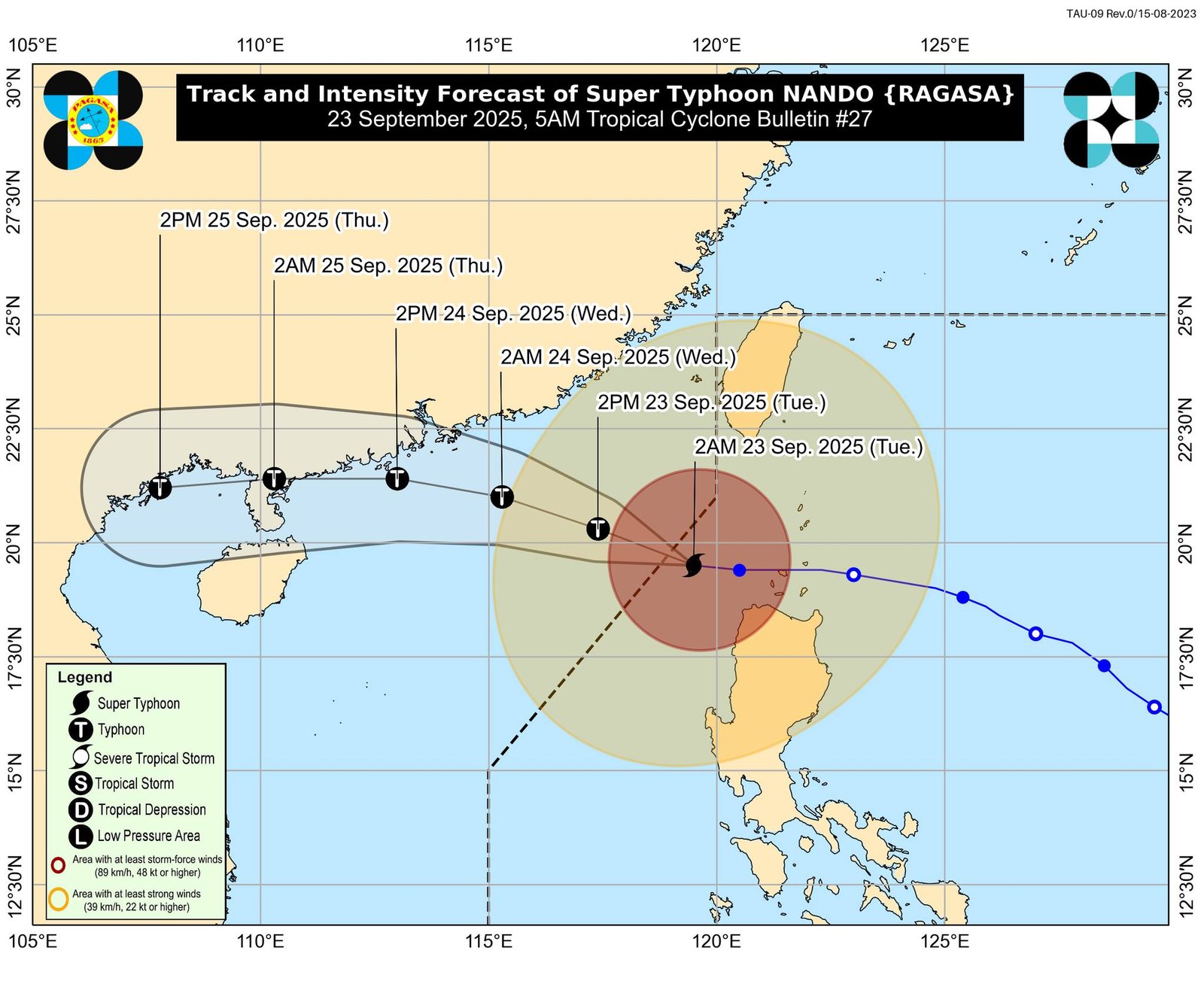 Signal No. 2: Batanes, natitirang Babuyan Islands, malaking bahagi ng Cagayan, Abra, Kalinga, Mountain Province, Benguet, Ilocos Sur, at hilagang La Union.